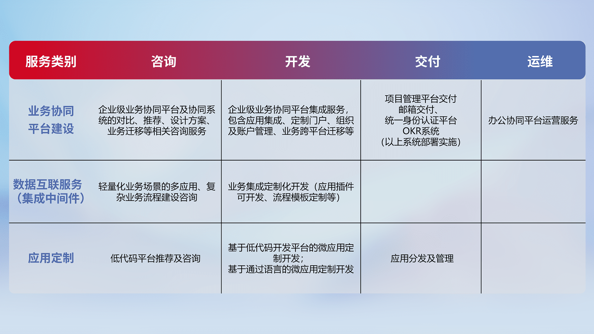 针对钉钉、、、企微、、IDaas等平台级产品提供产品的规划、、、方案、、、、交付、、、定制化开发等服务,,,,实现如统一协同办公、、、智能客户服务、、、、混合会议管理、、、、智能数据查询、、等业务场景,,,,实现数字化转型。。。